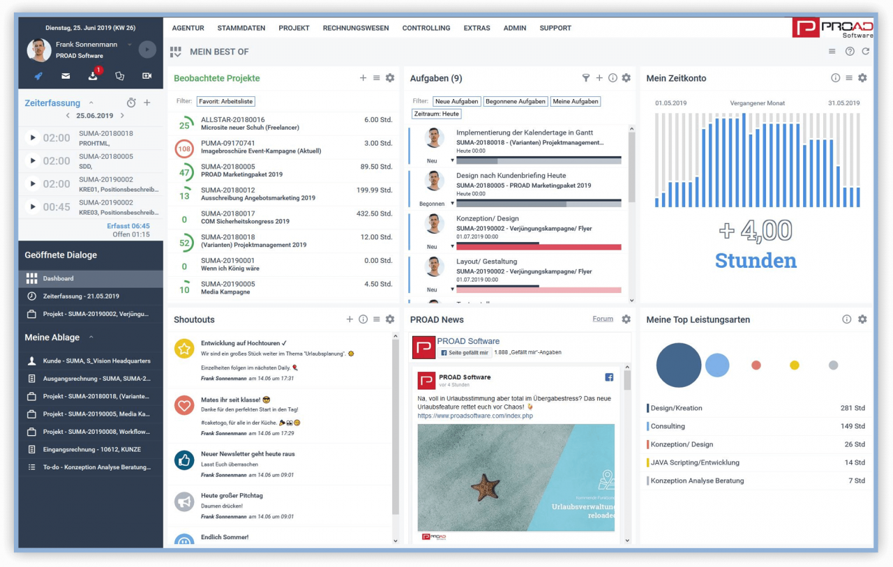 PROAD koordiniert euer gesamtes Prozessmanagement. Das bedeutet, mit Hilfe der Software könnt ihr alle Rollen in eurem Unternehmen abdecken. Die Verwaltung kann alle Angebote und Rechnungen organisieren, CFOs haben ihre Zahlen im Blick, das Projektmanagement kann seine Kalender synchronisieren und Gantt-Diagramme unterstützen den Alltag von allen. Ganz egal, ob organisiert oder chaotisch: Kreative Köpfe können mit Aufgabenplanern organisieren und analytische Menschen individuelle Dashboards mit Kennzahlen bauen. PROAD deckt alle Rollenverteilungen ab.